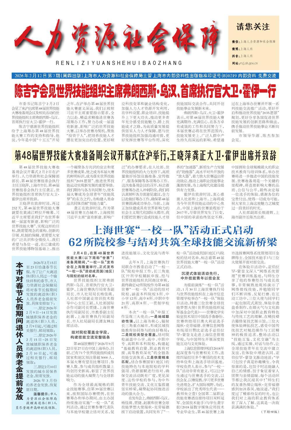 陈吉宁感谢世界技能组织给予上海筹办第48届世界技能大赛工作的支持和指导。他说,今年是中国“十五五”开局之年,在沪举办第48届世界技能大赛意义深远。我们正按照习近平主席重要指示要求,全力以赴、精益求精推进世赛各项筹办工作,努力办成一届富有新意、影响广泛的世界技能大赛。以举办世赛为契机,聚焦“投资于人”,把培养技能人才摆在更加突出的位置,更好顺应科技变革和就业结构变化,加强人力人才资源开发利用,在学科设置、职业培训、技能提升上下更大功夫,推动更多青年充分感受技能魅力、踏上技能成才之路,为高质量发展提供坚实人力人才保障。愿与世界技能组织加强沟通对接,更好发挥世赛等平台作用,深化技能国际交流合作,共同开创技能事业发展新未来。