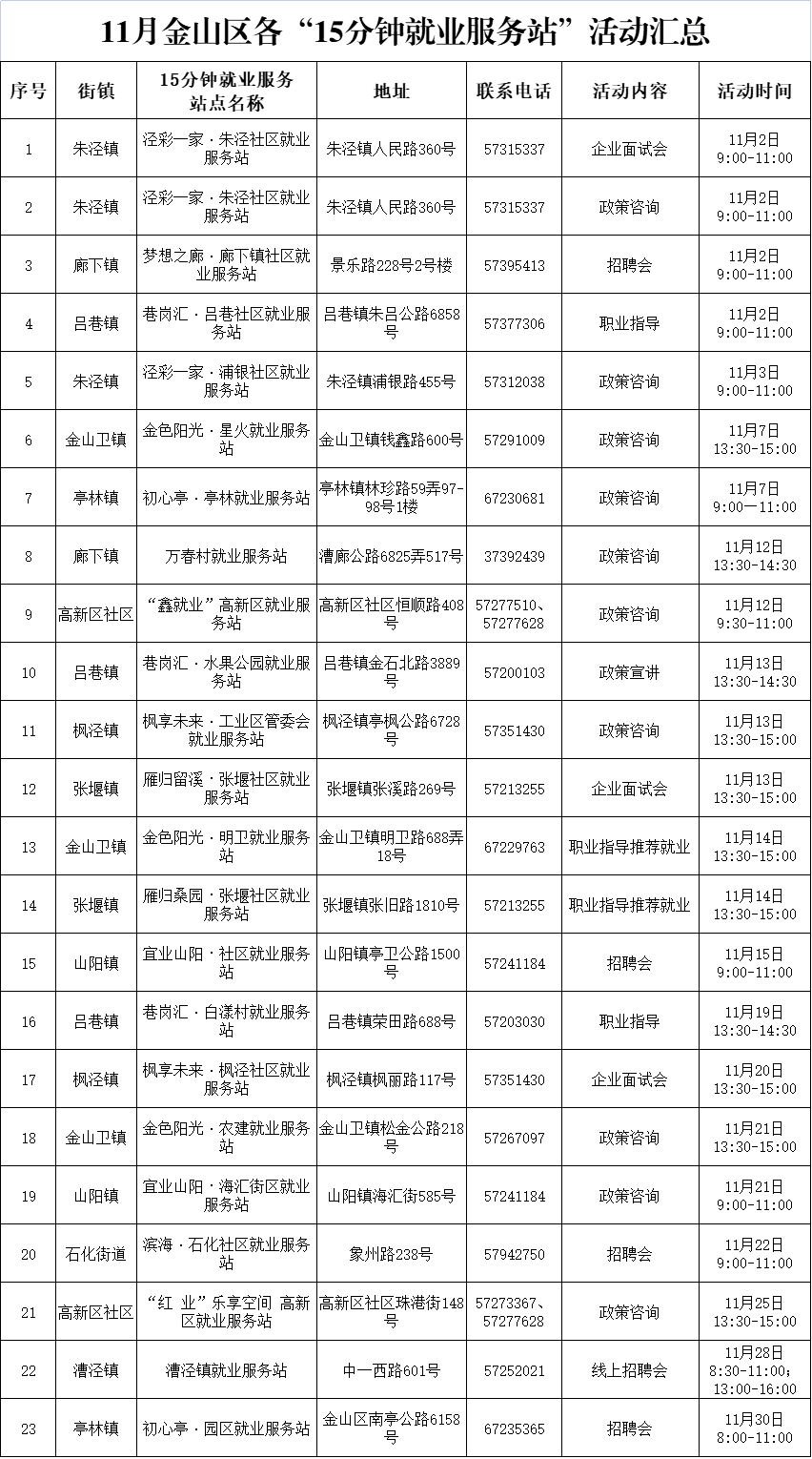 “15分钟就业服务圈”社区就业服务站点建设市政府实事项目作为人社部门常态化政府开放活动之一,我们将持续发布精彩服务内容,今天为大家带来黄浦区、长宁区、嘉定区、金山区、青浦区、崇明区、杨浦区、闵行区、宝山区近期就业活动安排!