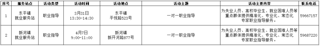 活动类别:招聘(面试)会、政策咨询(宣传)、职业技能培训、职业指导、创业指导、代理招聘