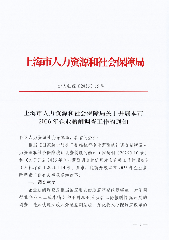 根据《国家统计局关于批准执行企业薪酬统计调查制度及人力资源和社会保障统计调查制度的函》(国统制〔2025〕10号)和《关于开展2026年企业薪酬调查和信息发布有关工作的通知》(人社厅函〔2026〕14号)要求,现就开展本市2026年企业薪酬调查工作有关事项通知如下: