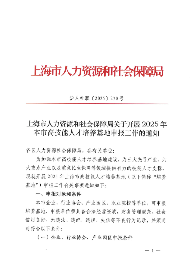 为加强本市高技能人才培养基地建设,为三大先导产业、六大重点产业以及重点民生保障等领域提供有力的技能人才支撑,现就开展2025年上海市高技能人才培养基地(以下简称“培养基地”)申报工作有关事项通知如下: