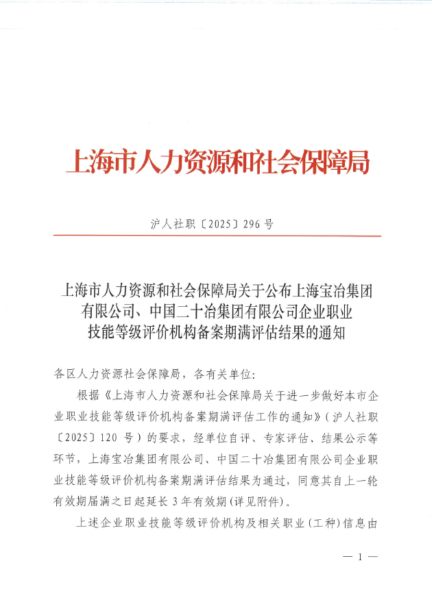 根据《上海市人力资源和社会保障局关于进一步做好本市企业职业技能等级评价机构备案期满评估工作的通知》(沪人社职〔2025〕120号)的要求,经单位自评、专家评估、结果公示等环节,上海宝冶集团有限公司、中国二十冶集团有限公司企业职业技能等级评价机构备案期满评估结果为通过,同意其自上一轮有效期届满之日起延长3年有效期(详见附件)。