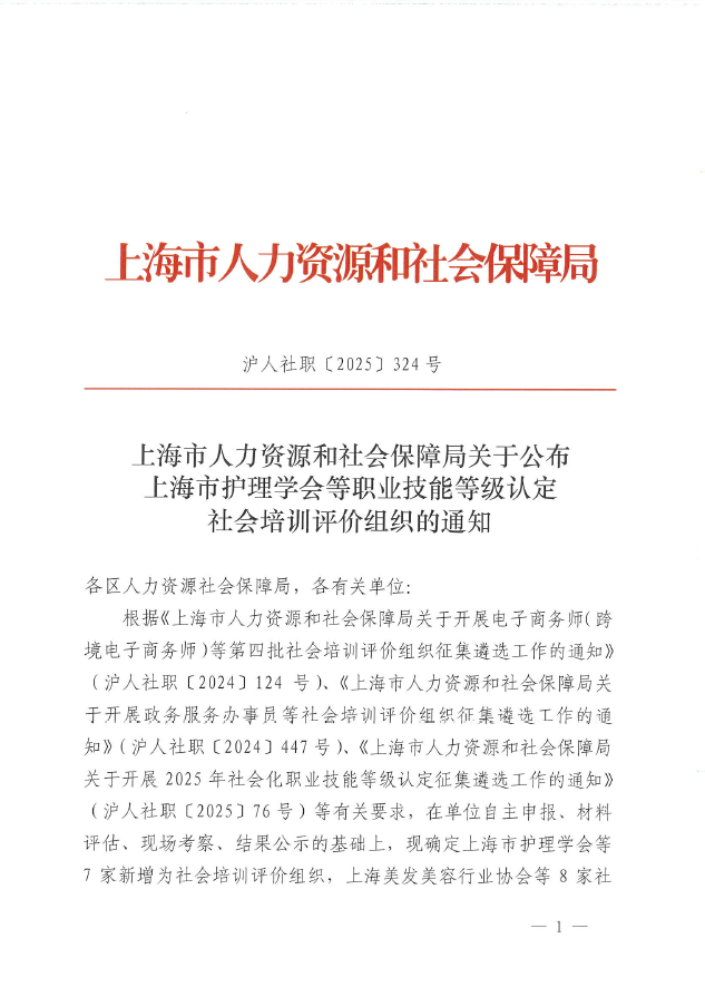 根据《上海市人力资源和社会保障局关于开展电子商务师(跨境电子商务师)等第四批社会培训评价组织征集遴选工作的通知》(沪人社职〔2024〕124号)、《上海市人力资源和社会保障局关于开展政务服务办事员等社会培训评价组织征集遴选工作的通知》(沪人社职〔2024〕447号)、《上海市人力资源和社会保障局关于开展2025年社会化职业技能等级认定征集遴选工作的通知》(沪人社职〔2025〕76号)等有关要求,在单位自主申报、材料评估、现场考察、结果公示的基础上,现确定上海市护理学会等7家新增为社会培训评价组织,上海美发美容行业协会等8家社会培训评价组织新增社会化评价项目,并予以公布(详见附件)。上述评价机构及相关职业(工种)信息将由“市人力资源社会保障局网站”(http://rsj.sh.gov.cn)和“技能人才评价工作网”(www.osta.org.cn)向社会公开并提供查询服务。其他遴选结果后续将另行动态发布。