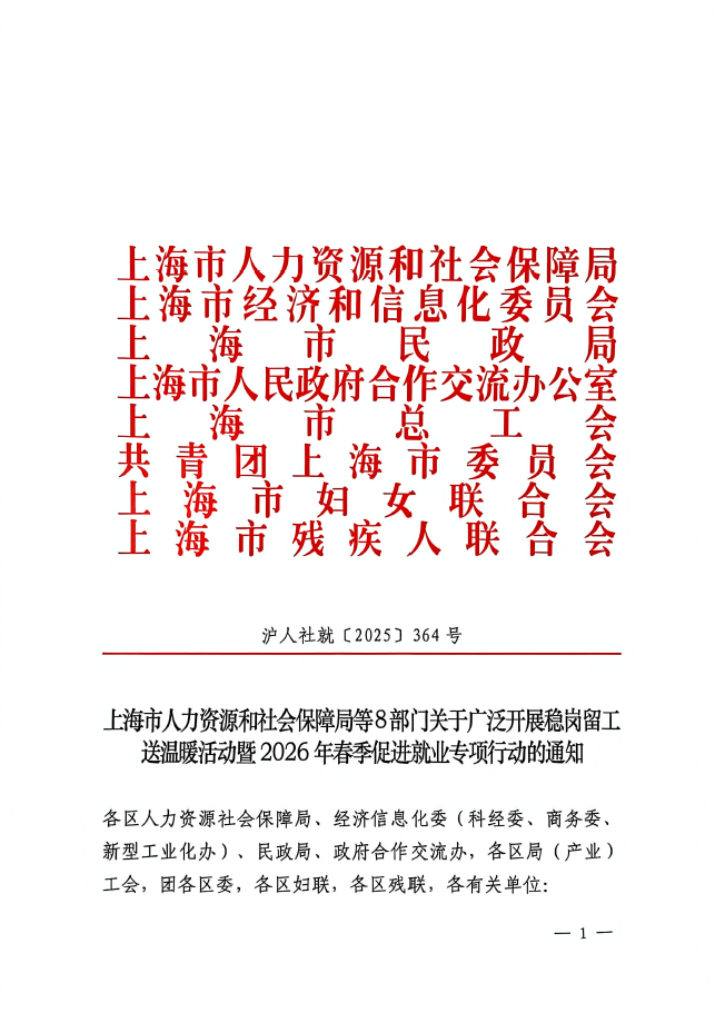 为深入学习贯彻习近平总书记考察上海重要讲话精神,全面贯彻党的二十届四中全会和十二届市委历次全会精神,贯彻落实党中央、国务院和市委、市政府关于稳就业工作的决策部署,坚持以人民为中心的发展思想,深入践行人民城市理念,积极做好元旦春节前后劳动者稳岗留工和返岗促就业以及企业用工保障工作,全力稳就业、保用工、优服务、促发展,根据人力资源社会保障部等部门关于开展2026年“春风行动”“就业援助月”“春暖农民工”等活动要求,市人力资源社会保障局、市经济信息化委、市民政局、市政府合作交流办、市总工会、团市委、市妇联、市残联决定开展稳岗留工送温暖活动暨2026年春季促进就业专项行动。现将有关事项通知如下: