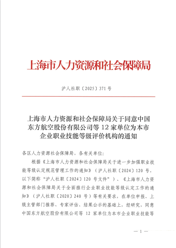 上海市人力资源和社会保障局关于同意中国东方航空股份有限公司等12家单位为本市企业职业技能等级评价机构的通知