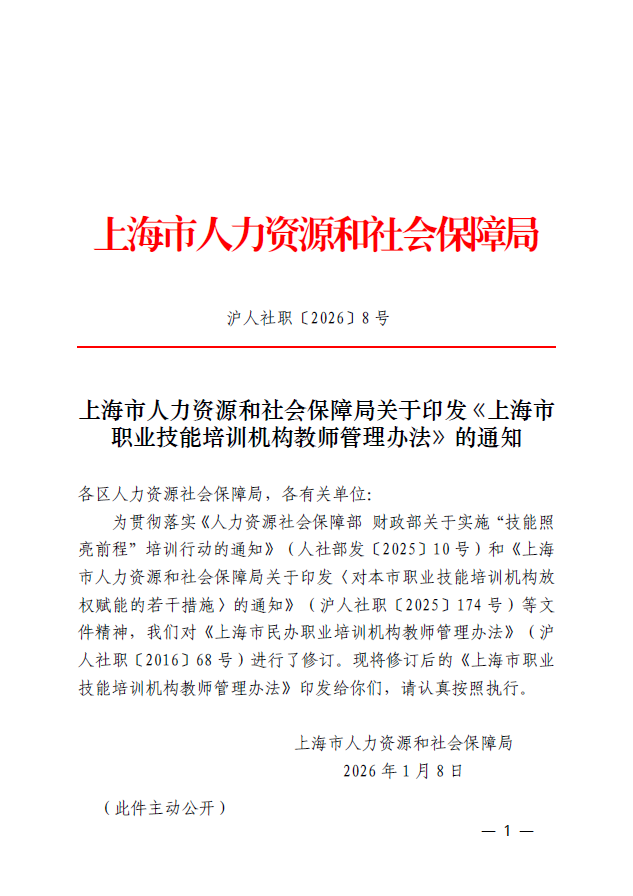 为贯彻落实《人力资源社会保障部 财政部关于实施“技能照亮前程”培训行动的通知》(人社部发〔2025〕10号)和《上海市人力资源和社会保障局关于印发〈对本市职业技能培训机构放权赋能的若干措施〉的通知》(沪人社职〔2025〕174号)等文件精神,我们对《上海市民办职业培训机构教师管理办法》(沪人社职〔2016〕68号)进行了修订。现将修订后的《上海市职业技能培训机构教师管理办法》印发给你们,请认真按照执行。