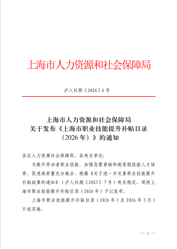 上海市职业技能提升补贴目录(2026年)自2026年3月1日起实施。