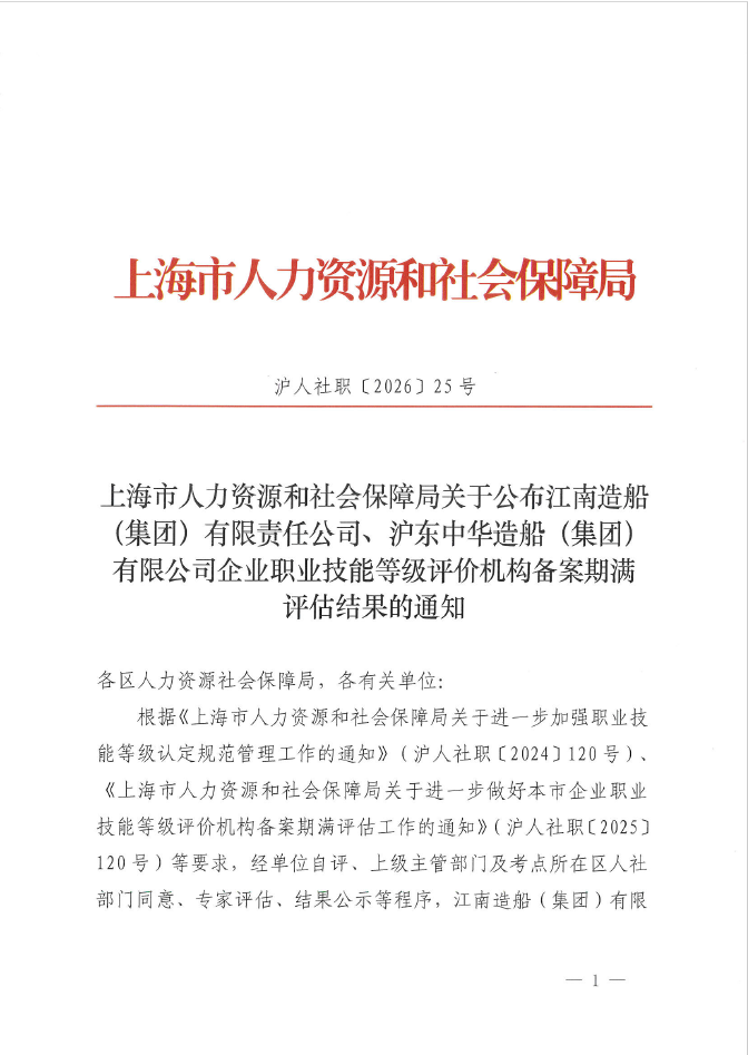根据《上海市人力资源和社会保障局关于进一步加强职业技能等级认定规范管理工作的通知》(沪人社职〔2024〕120号)、《上海市人力资源和社会保障局关于进一步做好本市企业职业技能等级评价机构备案期满评估工作的通知》(沪人社职〔2025〕120号)等要求,经单位自评、上级主管部门及考点所在区人社部门同意、专家评估、结果公示等程序,江南造船(集团)有限责任公司、沪东中华造船(集团)有限公司企业职业技能等级评价机构评估结果为通过,同意其备案有效期自上一轮届满之日起延长3年(详见附件)。