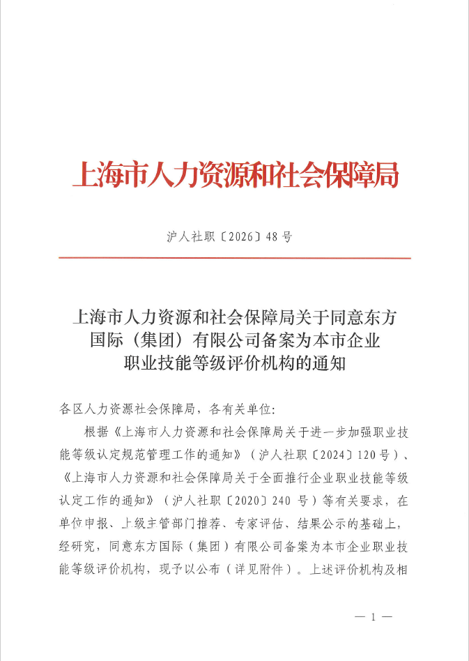 根据《上海市人力资源和社会保障局关于进一步加强职业技能等级认定规范管理工作的通知》(沪人社职〔2024〕120号)、《上海市人力资源和社会保障局关于全面推行企业职业技能等级认定工作的通知》(沪人社职〔2020〕240号)等有关要求,在单位申报、上级主管部门推荐、专家评估、结果公示的基础上,经研究,同意东方国际(集团)有限公司备案为本市企业职业技能等级评价机构,现予以公布(详见附件)。上述评价机构及相关职业(工种)信息将由“市人力资源社会保障局网站”(http://rsj.sh.gov.cn)和“技能人才评价工作网”(www.osta.org.cn)向社会公开并提供查询服务。
