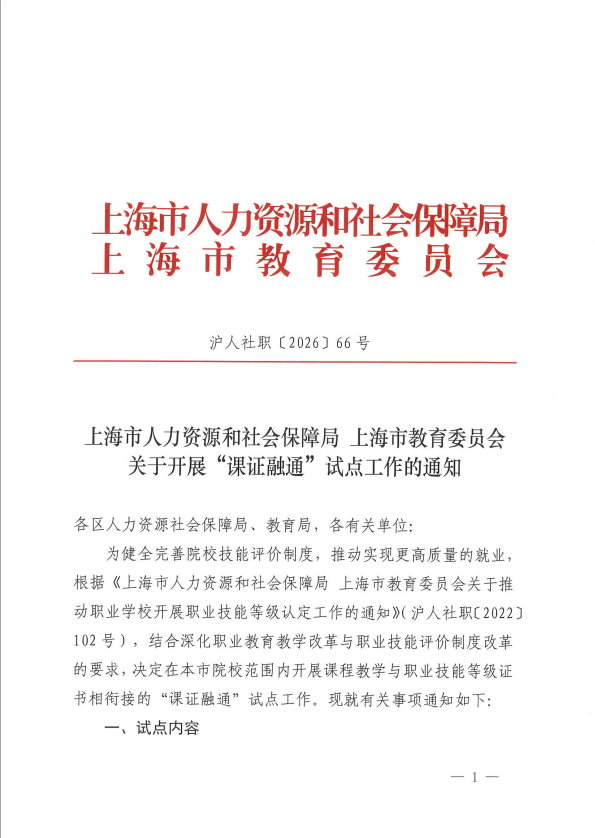 上海市人力资源和社会保障局上海市教育委员会关于开展“课证融通”试点工作的通知