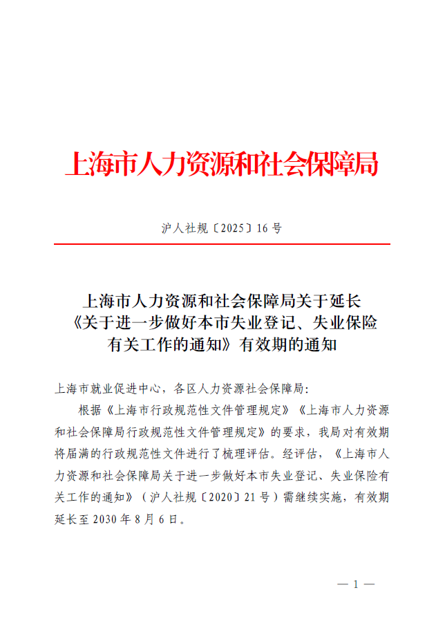 上海市人力资源和社会保障局关于延长《关于进一步做好本市失业登记、失业保险有关工作的通知》有效期的通知