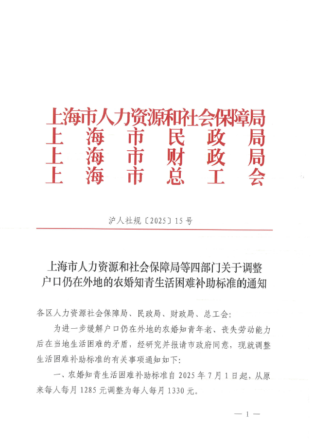 一、农婚知青生活困难补助标准自2025年7月1日起,从原来每人每月1285元调整为每人每月1330元。