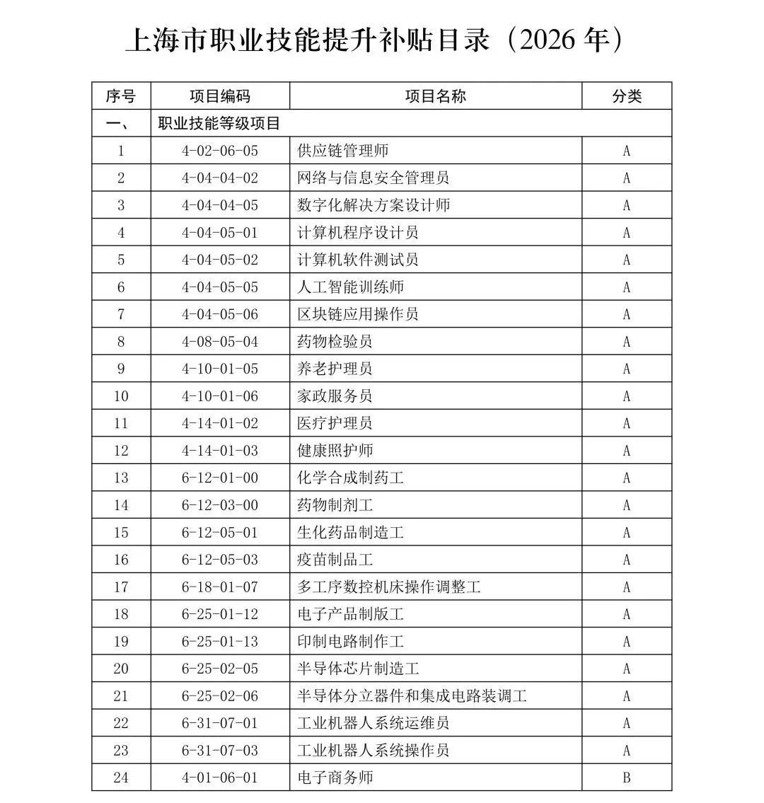 近期,本市正式印发了《上海市职业技能提升补贴目录(2026年)》,并自2026年3月1日起全面实施。新版目录围绕本市重点产业发展与技能人才队伍建设需要,对A类(重点支持)、B类(急需紧缺)、C类(其它补贴)项目进行了系统优化与动态调整,进一步将供应链管理师等一批项目纳入A类重点支持范围,并新增了健康照护师等职业,同时对B类、C类及部分技岗匹配项目进行了更新。