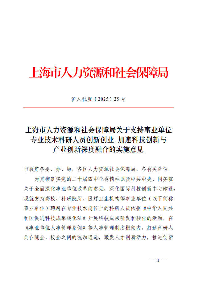 上海市人力资源和社会保障局关于支持事业单位专业技术科研人员创新创业 加速科技创新与产业创新深度融合的实施意见