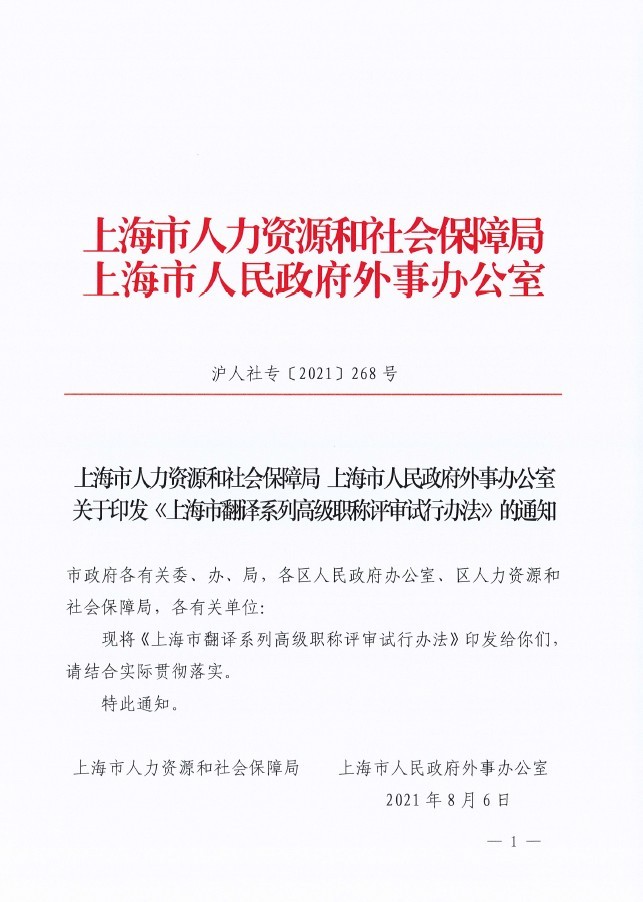 上海市人力资源和社会保障局 上海市人民政府外事办公室关于印发《上海市翻译系列高级职称评审试行办法》的通知