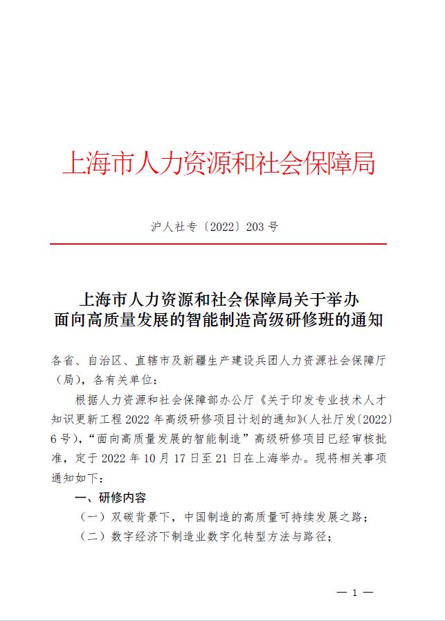 上海市人力资源和社会保障局关于举办面向高质量发展的智能制造高级研修班的通知
