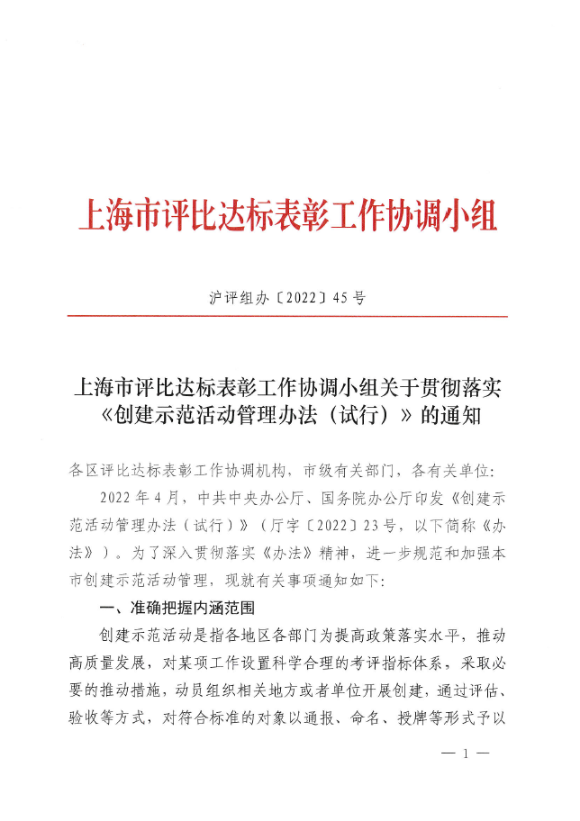 2022年4月,中共中央办公厅、国务院办公厅印发《创建示范活动管理办法(试行)》(厅字〔2022〕23号,以下简称《办法》)。为了深入贯彻落实《办法》精神,进一步规范和加强本市创建示范活动管理,现就有关事项通知如下: