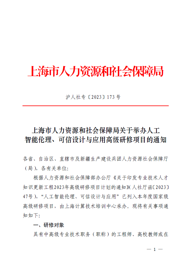 根据人力资源和社会保障部办公厅《关于印发专业技术人才知识更新工程2023年高级研修项目计划的通知》(人社厅函〔2023〕47号),“人工智能伦理、可信设计与应用”已列入本年度国家级高级研修项目,由上海计算技术培训中心承办。现将有关事项通知如下: