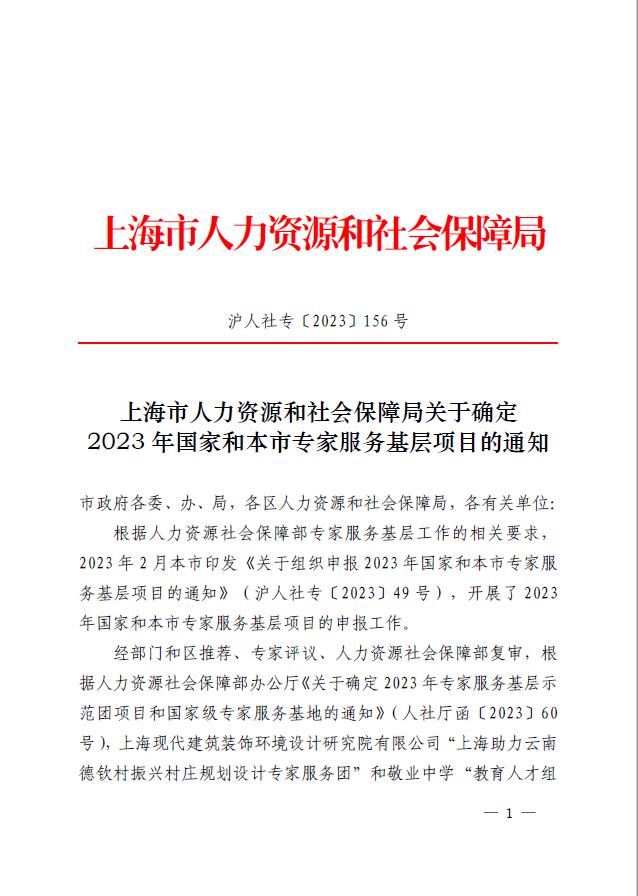 经部门和区推荐、专家评议、人力资源社会保障部复审,根据人力资源社会保障部办公厅《关于确定2023年专家服务基层示范团项目和国家级专家服务基地的通知》(人社厅函〔2023〕60号),上海现代建筑装饰环境设计研究院有限公司“上海助力云南德钦村振兴村庄规划设计专家服务团”和敬业中学“教育人才组团式帮扶云南专家服务团”列入人力资源社会保障部2023年专家服务基层示范团项目。