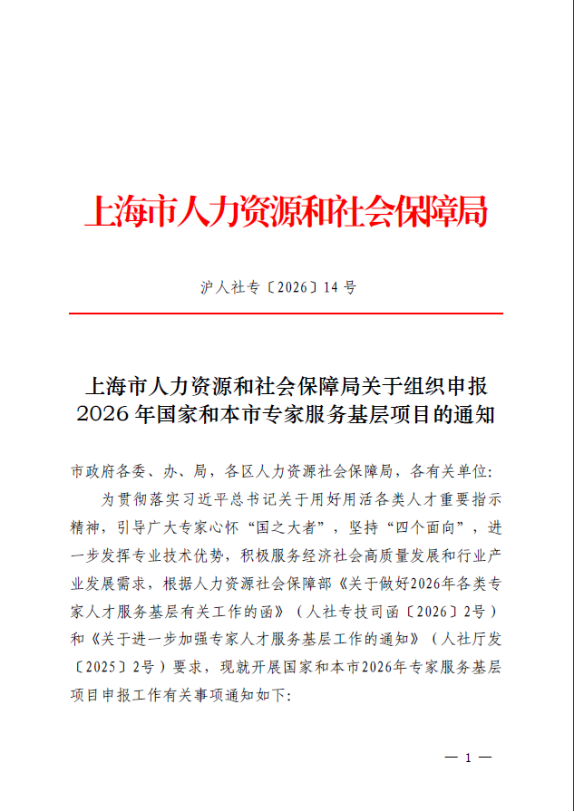 上海市人力资源和社会保障局关于组织申报2026年国家和本市专家服务基层项目的通知
