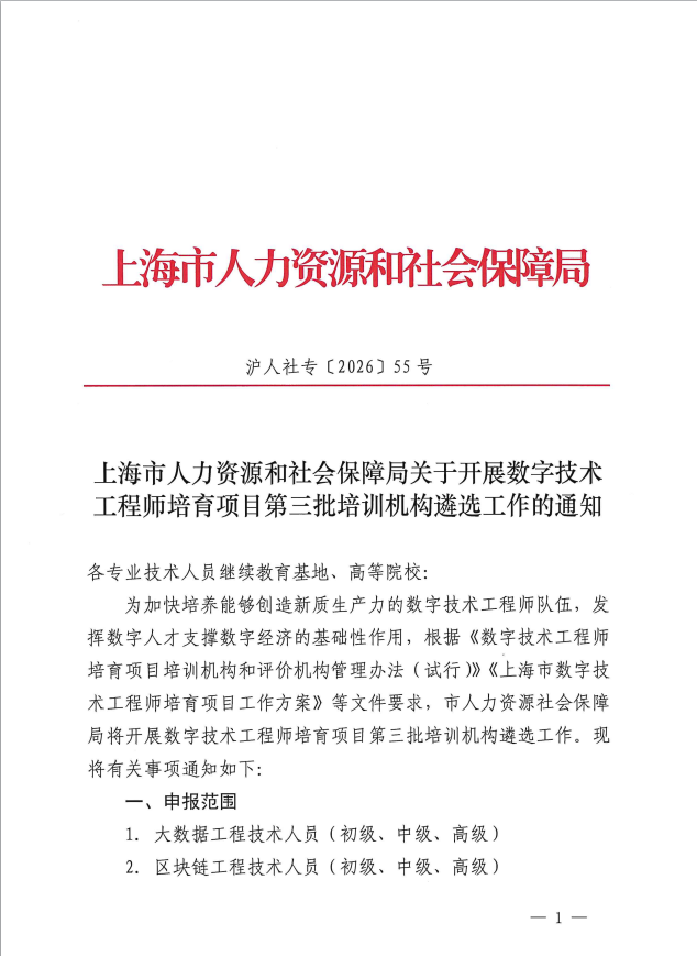 上海市人力资源和社会保障局关于开展数字技术工程师培育项目第三批培训机构遴选工作的通知