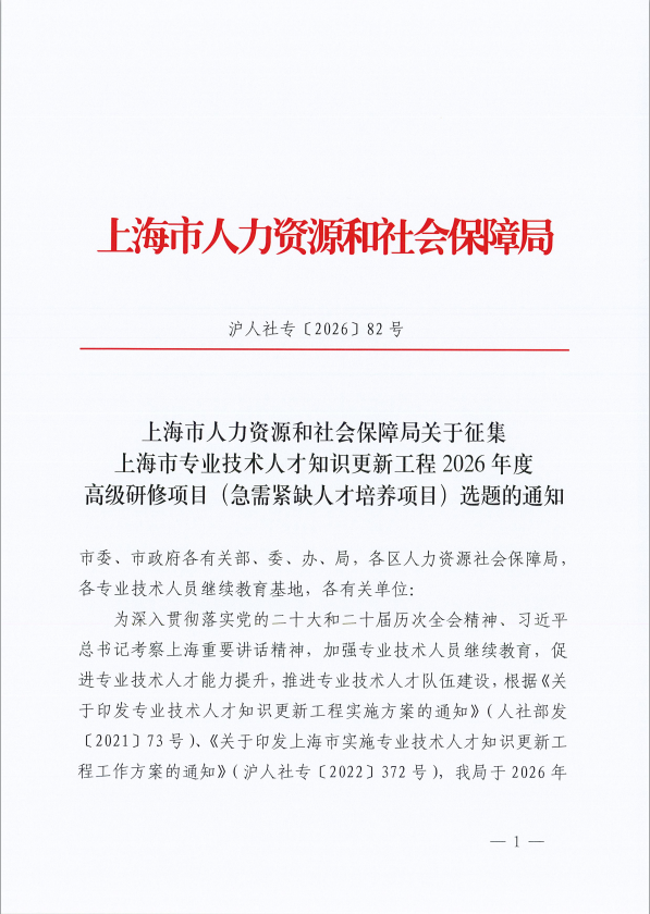 为深入贯彻落实党的二十大和二十届历次全会精神、习近平总书记考察上海重要讲话精神,加强专业技术人员继续教育,促进专业技术人才能力提升,推进专业技术人才队伍建设,根据《关于印发专业技术人才知识更新工程实施方案的通知》(人社部发〔2021〕73号)、《关于印发上海市实施专业技术人才知识更新工程工作方案的通知》(沪人社专〔2022〕372号),我局于2026年继续组织实施专业技术人才知识更新工程高级研修项目(急需紧缺人才培养项目),围绕加快形成新质生产力,培养造就一批创新型、应用型、技术技能型人才。现就有关事项通知如下: