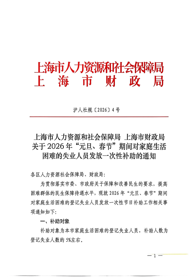 上海市人力资源和社会保障局 上海市财政局关于2026年“元旦、春节”期间对家庭生活困难的失业人员发放一次性补助的通知