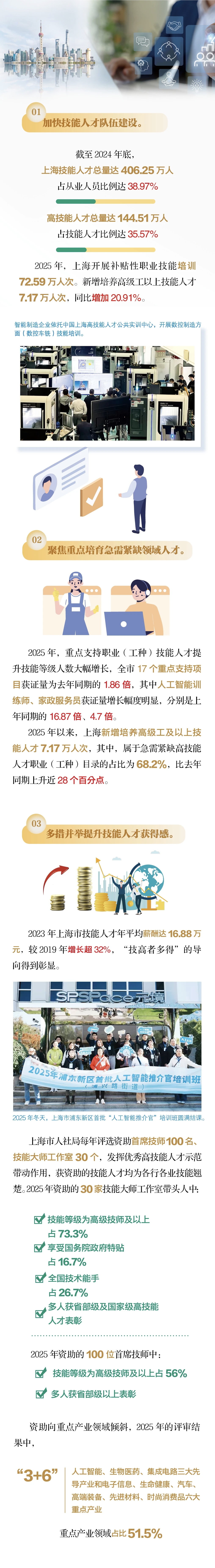 “十四五”期间,上海将技能人才工作视为推动高质量发展、培育新质生产力的战略基石,通过广泛覆盖、重点突出的政策设计,构建起多方参与、高效协作的技能人才培养体系,满足各类劳动者群体和企业对职业技能培训的多元化需求。