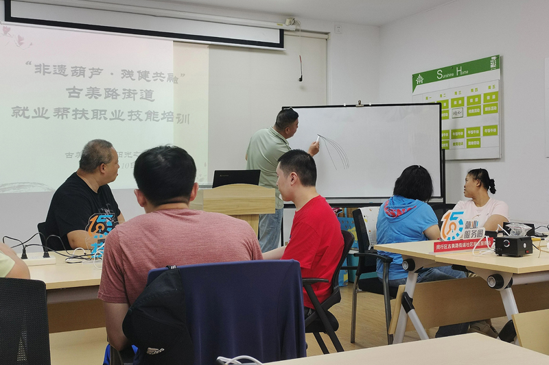 依托“15分钟就业服务圈”社区就业服务站,闵行区古美路街道社区事务受理服务中心将非遗葫芦纳入“技能加油站”的培训项目,面向残障人士与健康人群分别开设12周、每周一次的公益培训课。从社区授课到作品变现,葫芦扣上了实现就业的微小一环。