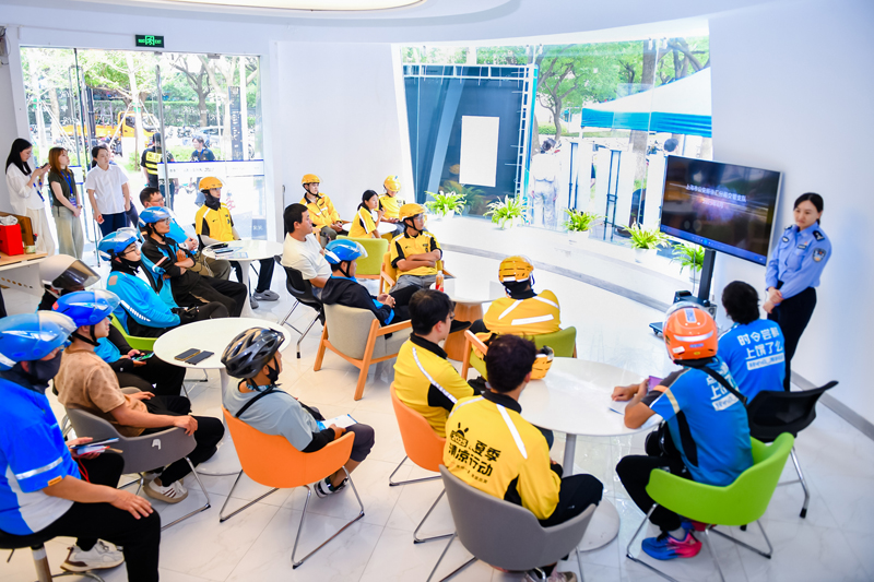 活动现场,各职能部门及商业保险机构设立联合咨询台,针对新就业群体关心的职业伤害确认条件、待遇申领流程等热点问题,提供“一对一”精准解答。同时,通过摆放宣传展板、张贴主题海报、派发出行礼包等形式,吸引过往群众驻足了解。内场则分批次邀请外卖骑手观看工伤保险政策及交通安全宣传短片,以真实案例为镜,详细讲解交通安全法规及事故申报流程,引导骑手规范出行、降低事故风险,掌握维权实操要点。