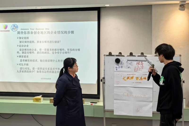 课堂最后,各小组还进行了精彩的路演展示,学员们轮流上台阐述自己的创业想法,展现了大学生独特的创新视角。讲师通过实时指导,针对每个项目的创新点和可行性给予了专业点评和建议,还就市场切入点、目标客户定位等关键问题提出了改进建议,帮助学员进一步完善创业计划,理解创业核心要素。