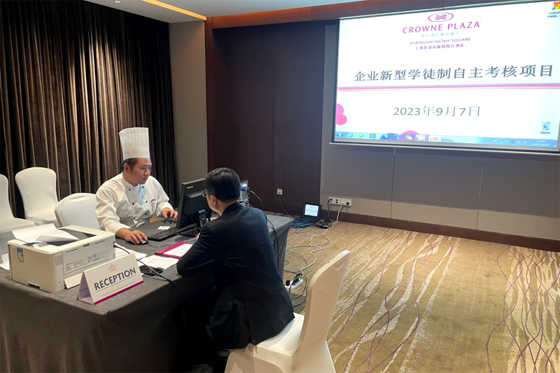 2022年8月,上海圣诺亚皇冠假日酒店(以下简称“圣诺亚”)“酒店宾客服务接待员(参照初级)”学徒制培训项目通过备案,正式开班。经过一年多的“理论+实践”“老师+师傅”“授课+实操”培养,44名岗位新兵顺利完成项目培训。通过培训,新员工快速掌握岗位技能,成为符合酒店期待的“技能型”员工。同时,一批“师傅”老员工在带徒过程中进一步提升了技能,发展成为“一专多能”的酒店管理人才。